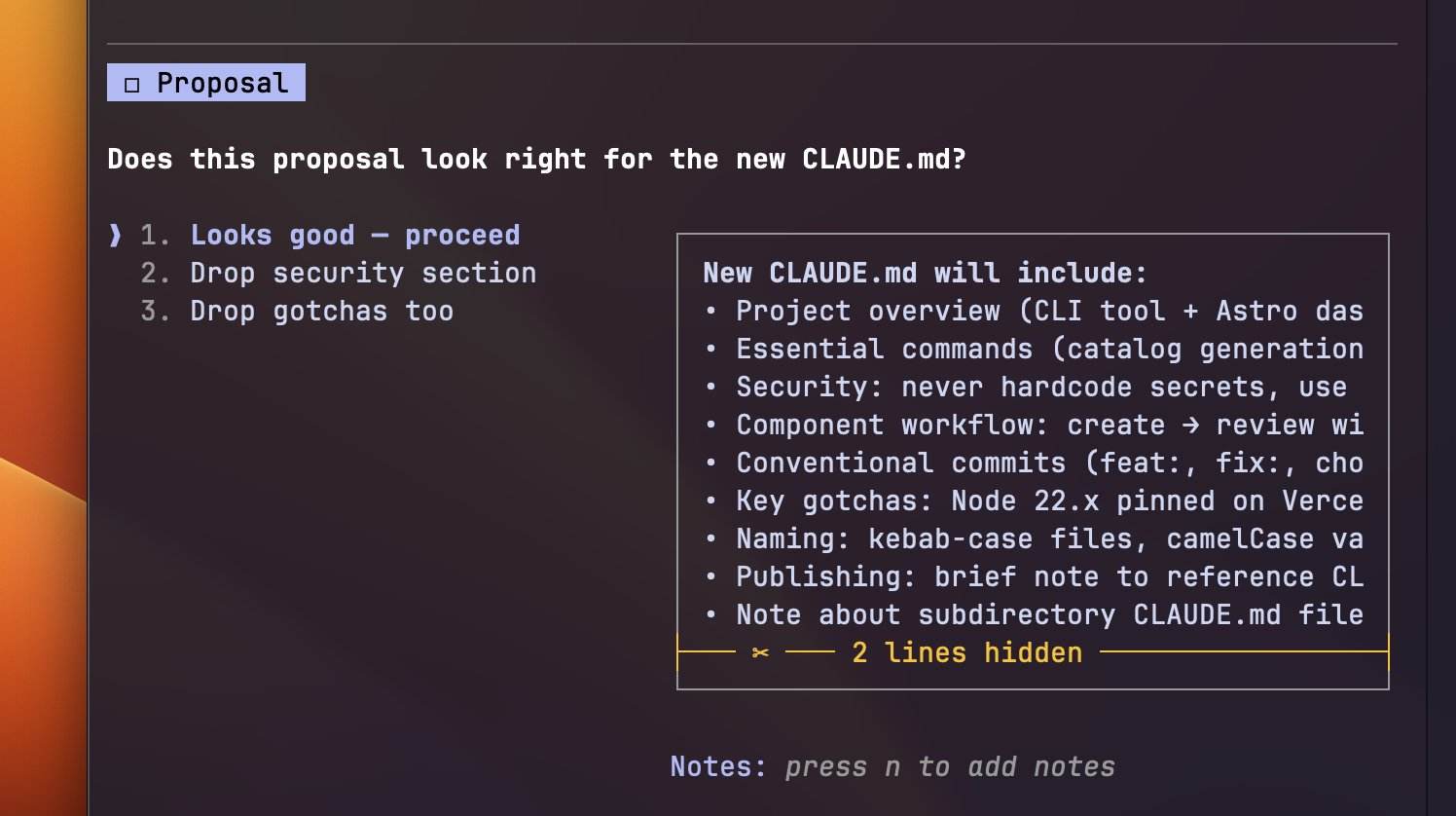 }Just run “/init”. The latest version automatically scans your codebase to pick up on your tech stack, linters, and CI configs. You'll even get a chance to review and approve the proposal before anything actually gets written.