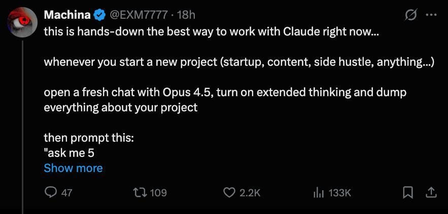 An AI engineer's workflow is blowing up on X, and it's surprisingly simple. Instead of jumping straight into Claude Code, start in Opus 4.5 with extended thinking.