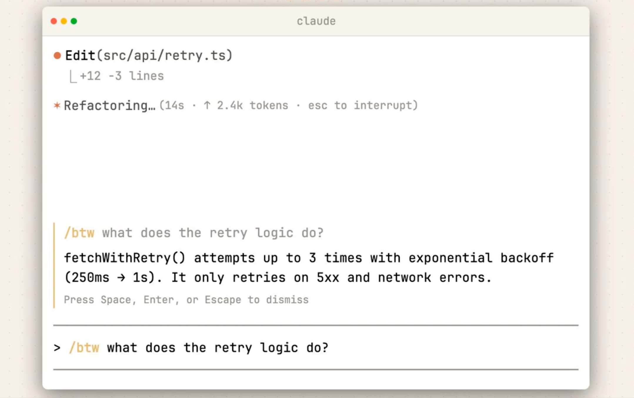 Imagine you're in the middle of a refactor in Claude Code and need to verify something quickly. Maybe you're wondering which config file Claude is reading, or what a specific function in another file actually does. Previously, you'd have to cancel the current response or wait for it to finish.